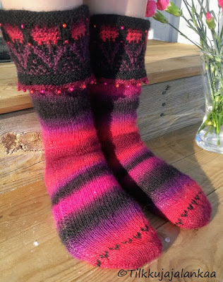 Alkuperäiseen ohjeeseen poiketen siis vaihdoin ohueempaan lankaan ja puikkoihin. Näin ollen silmukkamääriä piti tarkastella ja laskeskella uusiksi. Kääntövarteen neuloin ensin muutaman kierroksen ainaoikein neuletta ja varsinaista mosaiikkineuletta muokkasin niin että kukka- ja kuvioosuuden neuloin nurjalla ja mustan sileää, jolloin kuvio nousee hieman koholle pohjaväristä. Joka puolestaan erottuisi kuvattuna paremmin vaaleammasta pohjaväristä, mutta tykkään kyllä tosi paljon tästä värityksestä. Kukkien varret neuloin yksivärisellä Fabelilla ja kukkaan otin mukaan sitten Langin liukuvärjätyn langan, jolla myös kääntövartta ja kärjen mosaiikkineuletta lukuun ottamatta sukka on neulottu. Mustassa langassa on sekaisin Fabelia ja ohutta Opalia, silla pikasilmäyksellä ajattelin niiden olevan samaa, mutta kesken neulonnan toisen kerän sisältä putkahti joskus sinne työntämäni vyöte, joka kertoi langan olevankin Fabelin sijasta Opalia. Käyttö sitten kertoo onko langoissa pesun, venymisen ja nukkaamisen kannalta eroja, mutta en enää osaa sanoa kummassa sukassa on kumpaa lankaa.Pikkuvalmikoiden paikkaa ja määrää myös muokkasin ja lisäsin taakse keskelle palmikon, joka jatkuu kantapäähän asti, ja jalkapöydältä poistin kaksi palmikkoa. Kantapään halusin tehdä samaa tyyliä noudattaen kuin alkuperäisessäkin, sillä se oli niin kaunis pikku palmikoiden myötäillessä kiilalisäyksiä. Kärjessä on myös neulottu alkuperäisen sukan mosaaiikkineuleella sydäntä muistuttava kuvio ja sukka päättyy leveään nauhakavennukseen.