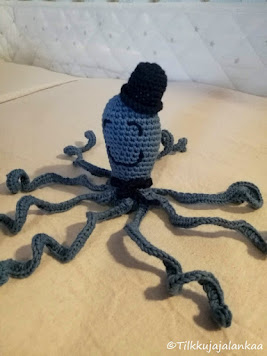 Perheen uudelle tulokkaalle virkkasin keväällä oman pikku mustekalan, tutummin häntä kutsutaan nimellä Herra Lonkeroinen. Hän onkin aika vekkulin oloinen kaveri ja iloisella mielellä hän jäi odottamaan uutta kaveria syntyväksi. Pitkä odotus sitten palkittiinkin toukokuun lopulla ja pieni mies saapui ihmettelemään maailmaan ja ilahduttamaan häntä kovasti jo odottanutta perhettä.